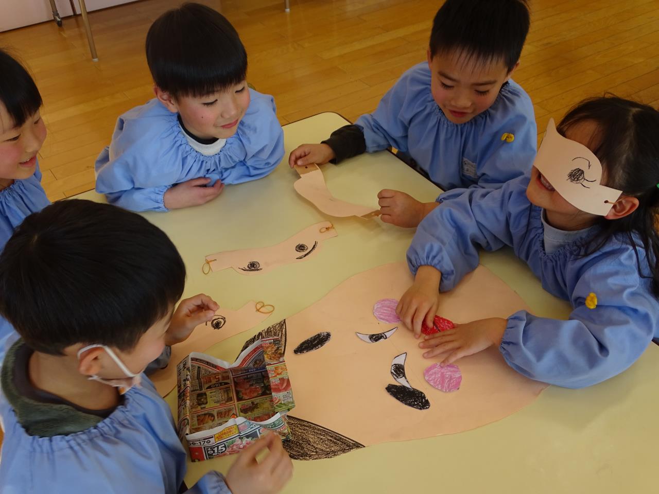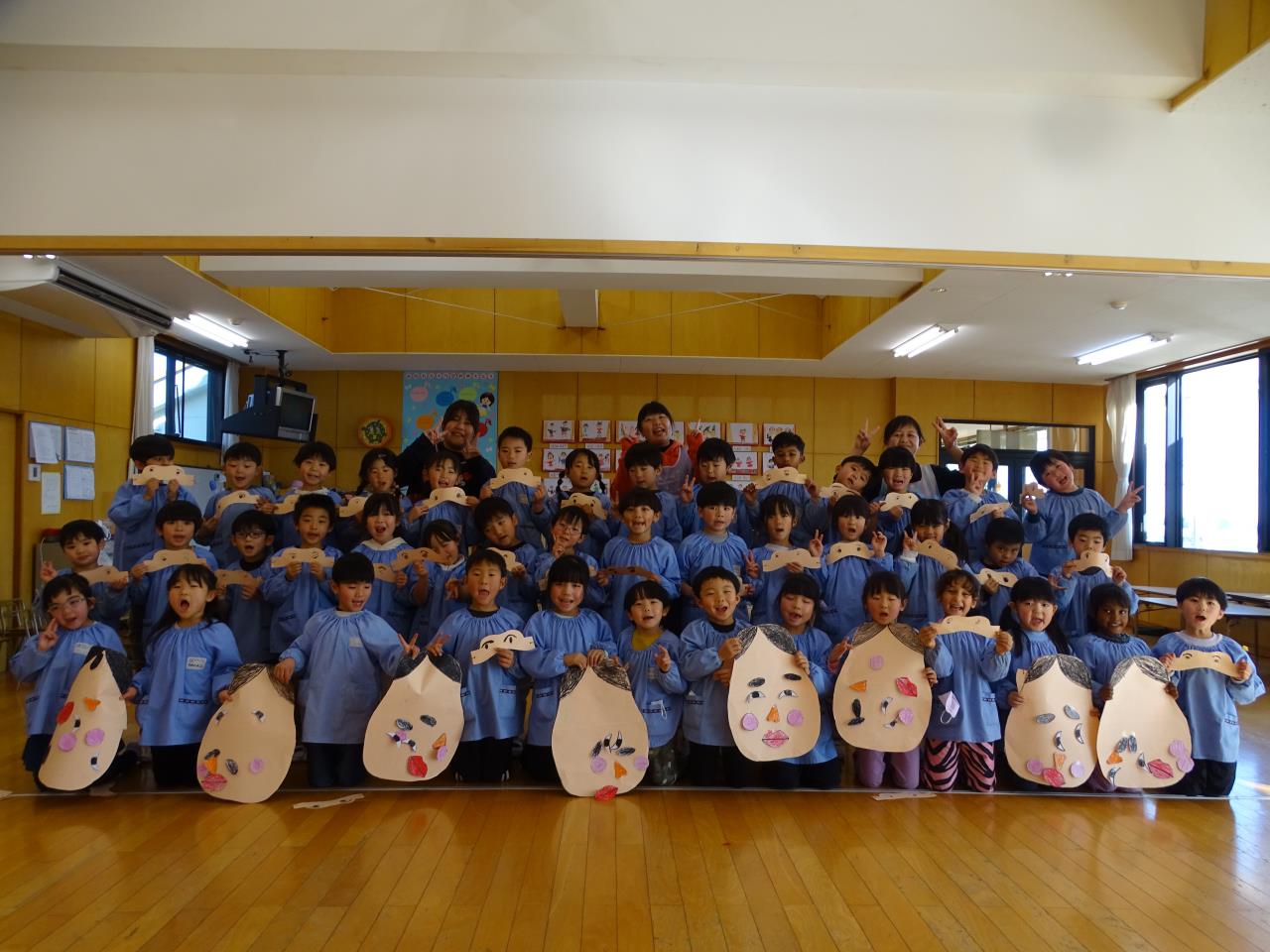 また、自分たちで作ったアイマスクで 目かくしをして 福笑いもしました(≧▽≦) 「せんせい!みて~!」 「おもしろい顔になったよ~!」 と、大盛り上がり~(^^♪ 完成した福笑いの顔と みんなの幸せを願い 「ハイポーズ!!」 みんなの顔も福笑いの顔も 素敵な表情で とっても可愛かったです♡