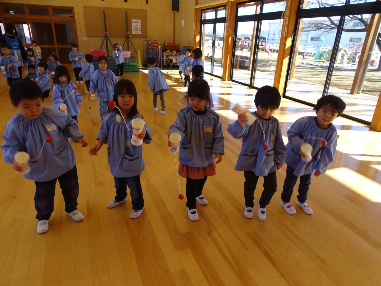 「だるま落とし」と「羽根つき」に 挑戦しました! 崩さないように 苦戦しながらも、 力を込めてだるまを叩いたり、 今年の干支「午」を描いた 羽子板でお友だちと息を合わせて とても盛り上がっていました☆ 【りす組】 「たこあげ」と 手作りおもちゃ「ぷくぷくおもち」で 遊びました(*^^*) たこを持ち、お友だちと 「よーいどん!」の 掛け声と共に走ったり、 ほっぺをおもちのように膨らませて ぷくーっと息を吹いて ビニールのおもちが大きく膨らむ 様子を楽しんでいました♪ 【ひよこ組】 「たこあげ」と「起き上がりこぼし」に 挑戦しました! ちいさな手で懸命に たこを持って走ったり だるまの形をした起き上がりこぼしを 「ごろごろ~!」と 言いながら不思議そうに 触る姿がとても可愛かったです♡ 伝統ある遊びを通して 日本の文化に親しむ ことができましたね(*^^*) |