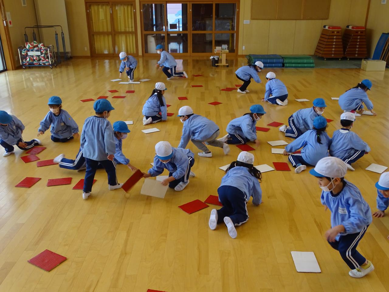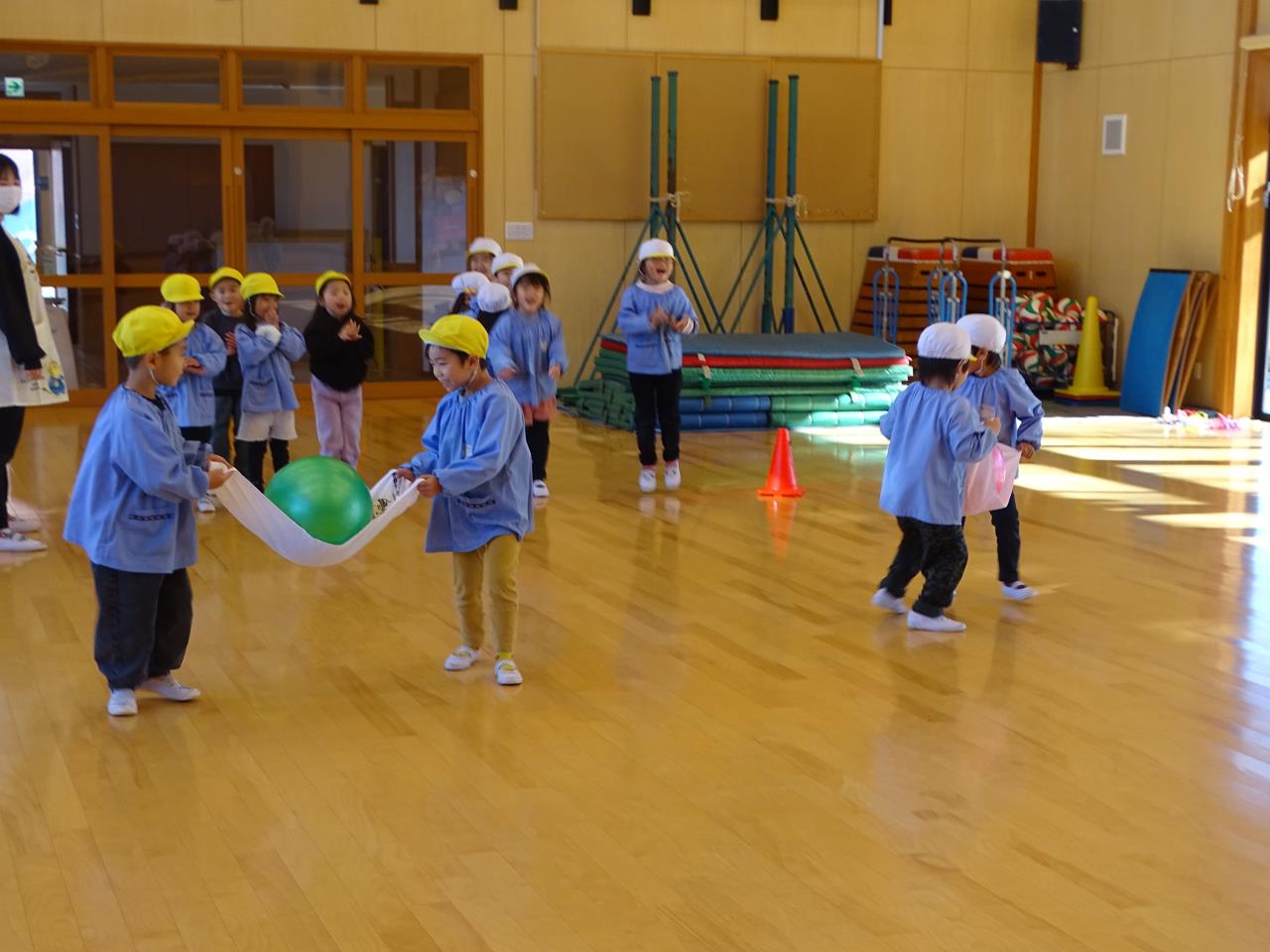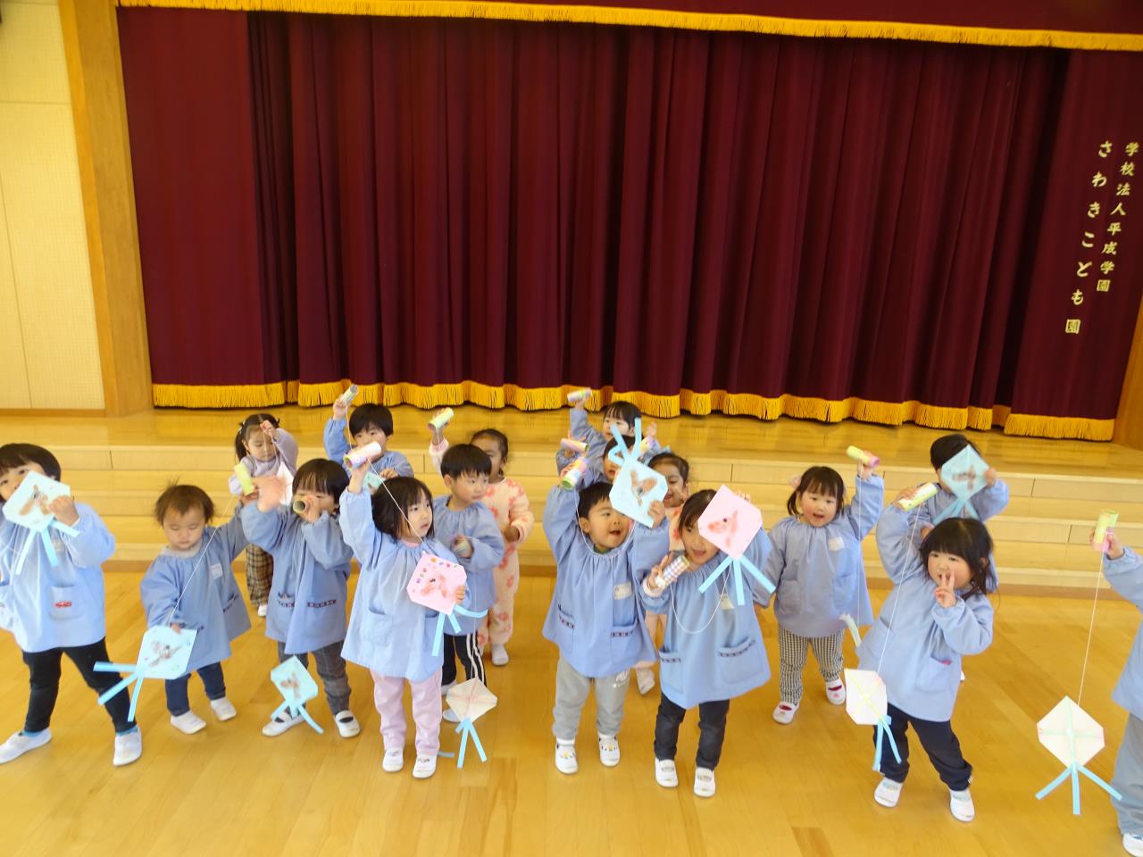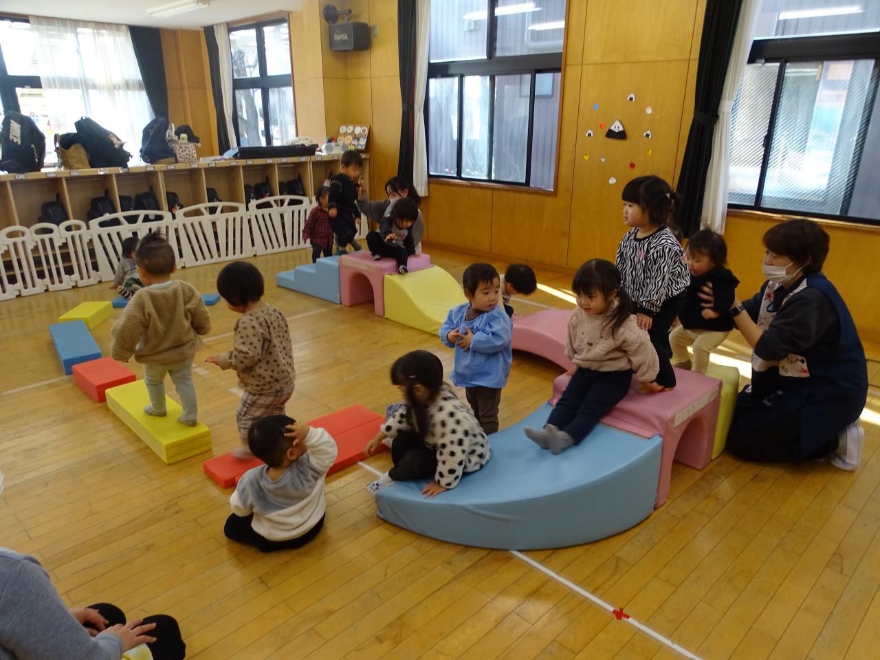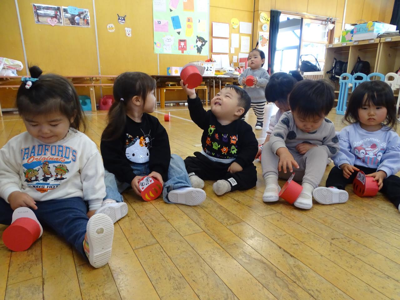 「だるま落とし」と「羽根つき」に 挑戦しました! 崩さないように 苦戦しながらも、 力を込めてだるまを叩いたり、 今年の干支「午」を描いた 羽子板でお友だちと息を合わせて とても盛り上がっていました☆ 【りす組】 「たこあげ」と 手作りおもちゃ「ぷくぷくおもち」で 遊びました(*^^*) たこを持ち、お友だちと 「よーいどん!」の 掛け声と共に走ったり、 ほっぺをおもちのように膨らませて ぷくーっと息を吹いて ビニールのおもちが大きく膨らむ 様子を楽しんでいました♪ 【ひよこ組】 「たこあげ」と「起き上がりこぼし」に 挑戦しました! ちいさな手で懸命に たこを持って走ったり だるまの形をした起き上がりこぼしを 「ごろごろ~!」と 言いながら不思議そうに 触る姿がとても可愛かったです♡ 伝統ある遊びを通して 日本の文化に親しむ ことができましたね(*^^*) |