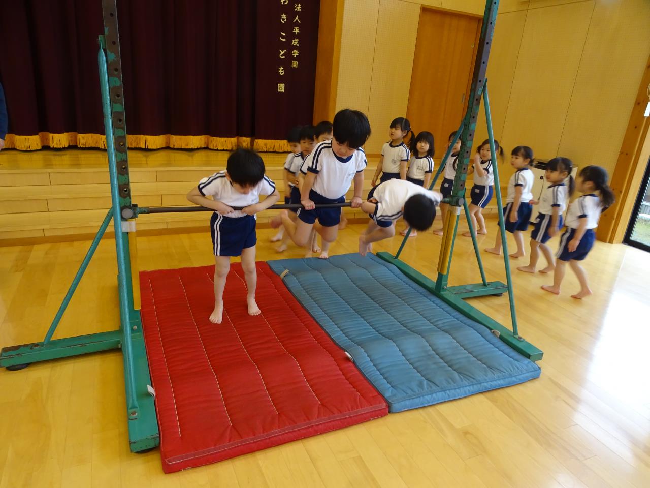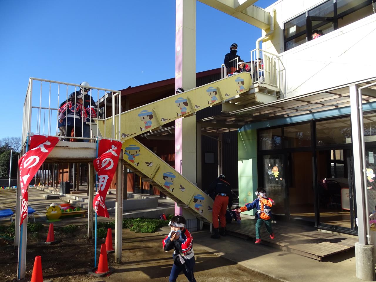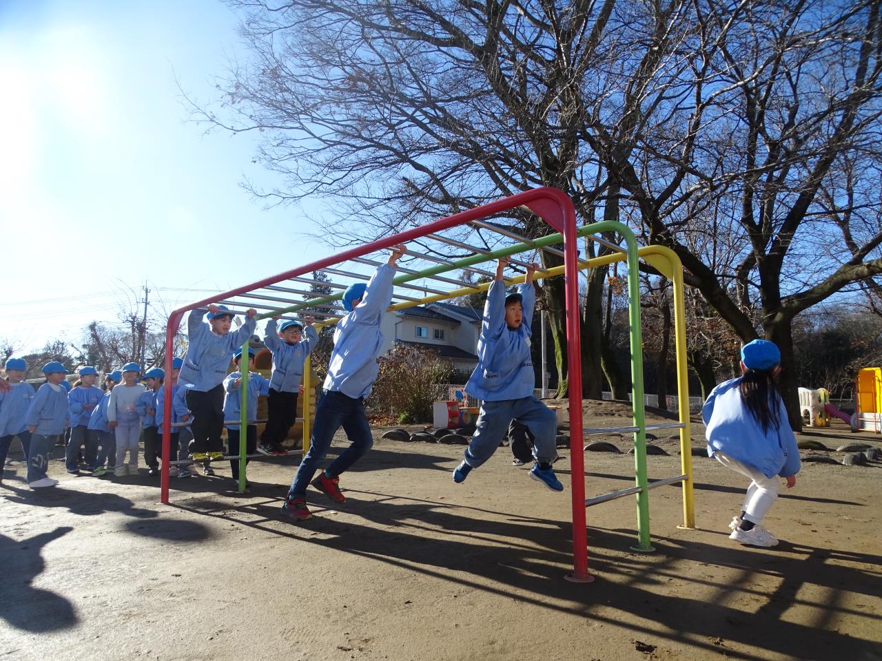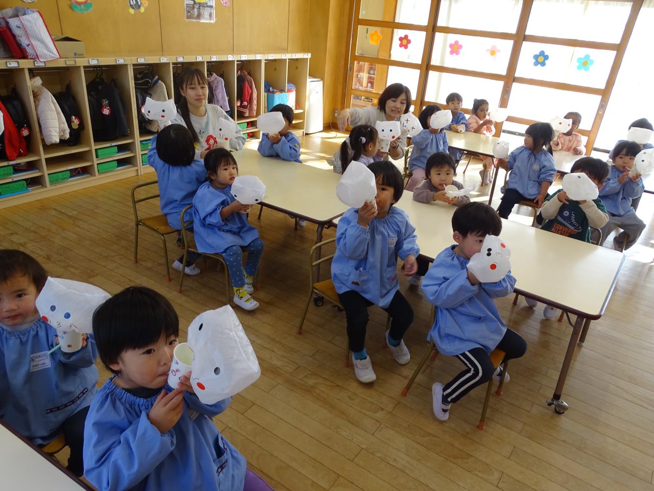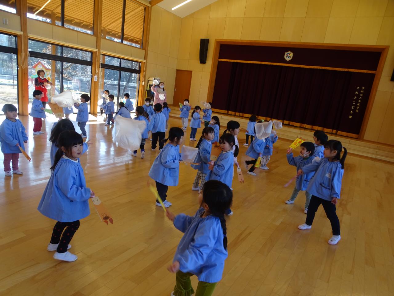 「だるま落とし」と「羽根つき」に 挑戦しました! 崩さないように 苦戦しながらも、 力を込めてだるまを叩いたり、 今年の干支「午」を描いた 羽子板でお友だちと息を合わせて とても盛り上がっていました☆ 【りす組】 「たこあげ」と 手作りおもちゃ「ぷくぷくおもち」で 遊びました(*^^*) たこを持ち、お友だちと 「よーいどん!」の 掛け声と共に走ったり、 ほっぺをおもちのように膨らませて ぷくーっと息を吹いて ビニールのおもちが大きく膨らむ 様子を楽しんでいました♪ 【ひよこ組】 「たこあげ」と「起き上がりこぼし」に 挑戦しました! ちいさな手で懸命に たこを持って走ったり だるまの形をした起き上がりこぼしを 「ごろごろ~!」と 言いながら不思議そうに 触る姿がとても可愛かったです♡ 伝統ある遊びを通して 日本の文化に親しむ ことができましたね(*^^*) |