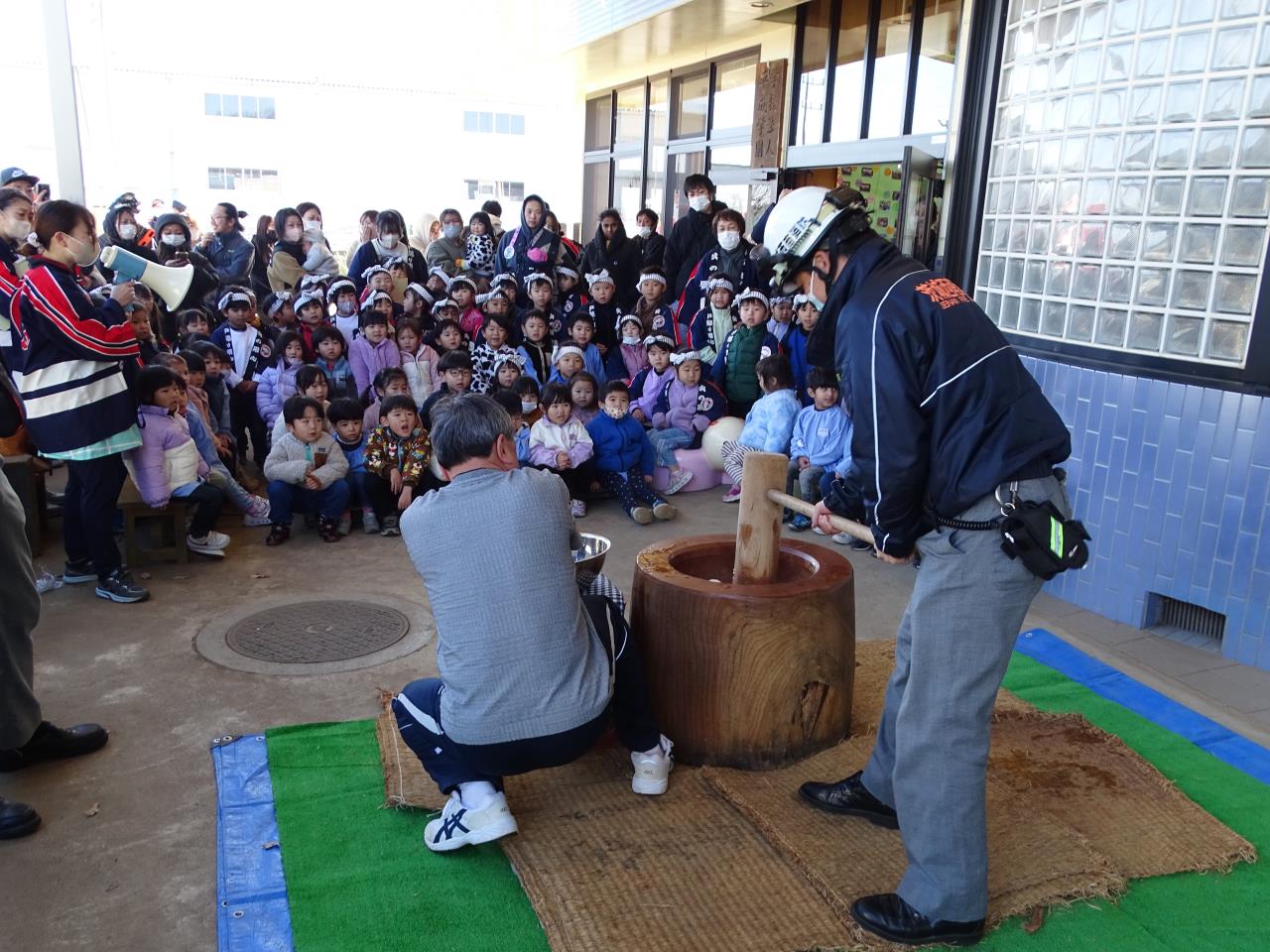 命を守るために大切な 避難訓練を行いました! 先生のお話をよく聞いて すばやく避難することができました☆ また、消防士さんから改めて 災害の恐ろしさや自分の身を守る方法を 教えて頂きました!! 消防車やはしご車の見学をさせてもらい 子どもたちは大興奮!!! 年長さんは実際に、はしご車に 乗せてもらいました♪ そして避難訓練後はもちつき大会! うすの中でもち米をきねでつくと 少しずつおもちになっていく様子に 「すごーい!!」と感動している 様子でした♡ また、「よいしょー!よいしょー!」と 元気にもちつきを応援しました! つきたてのおもちは、 とってもおいしかったです♪ |
