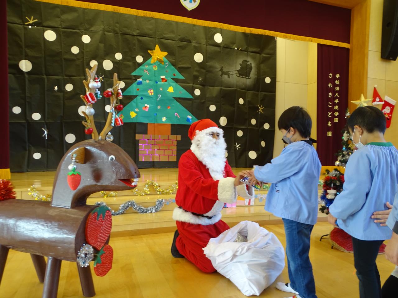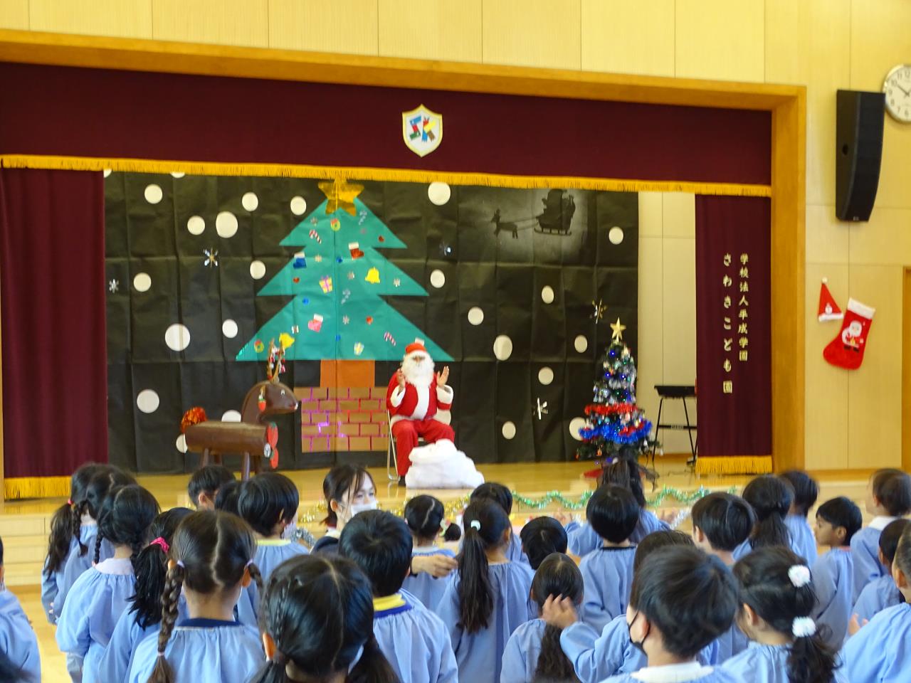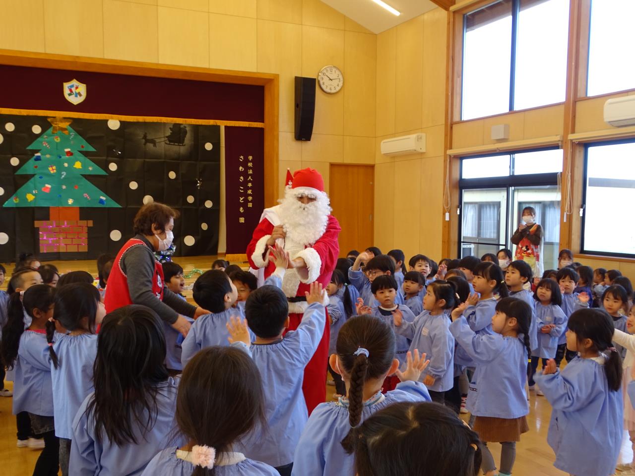 大型絵本を見たり ロウソクの手遊びをして 楽しんでいると・・・ サンタさんからの手紙が 届いているのを見つけました! 「いつも頑張っているみんなに プレゼントを持って会いに行くよ」と メッセージが♪♪ すると鈴の音が聞こえ始め サンタさんが来てくれました! 嬉しさとびっくりで さまざまな表情をする 子どもたち♡ とっても可愛かったです(*^^*) また一つ嬉しい思い出が できましたね☆ メリークリスマス‼ |