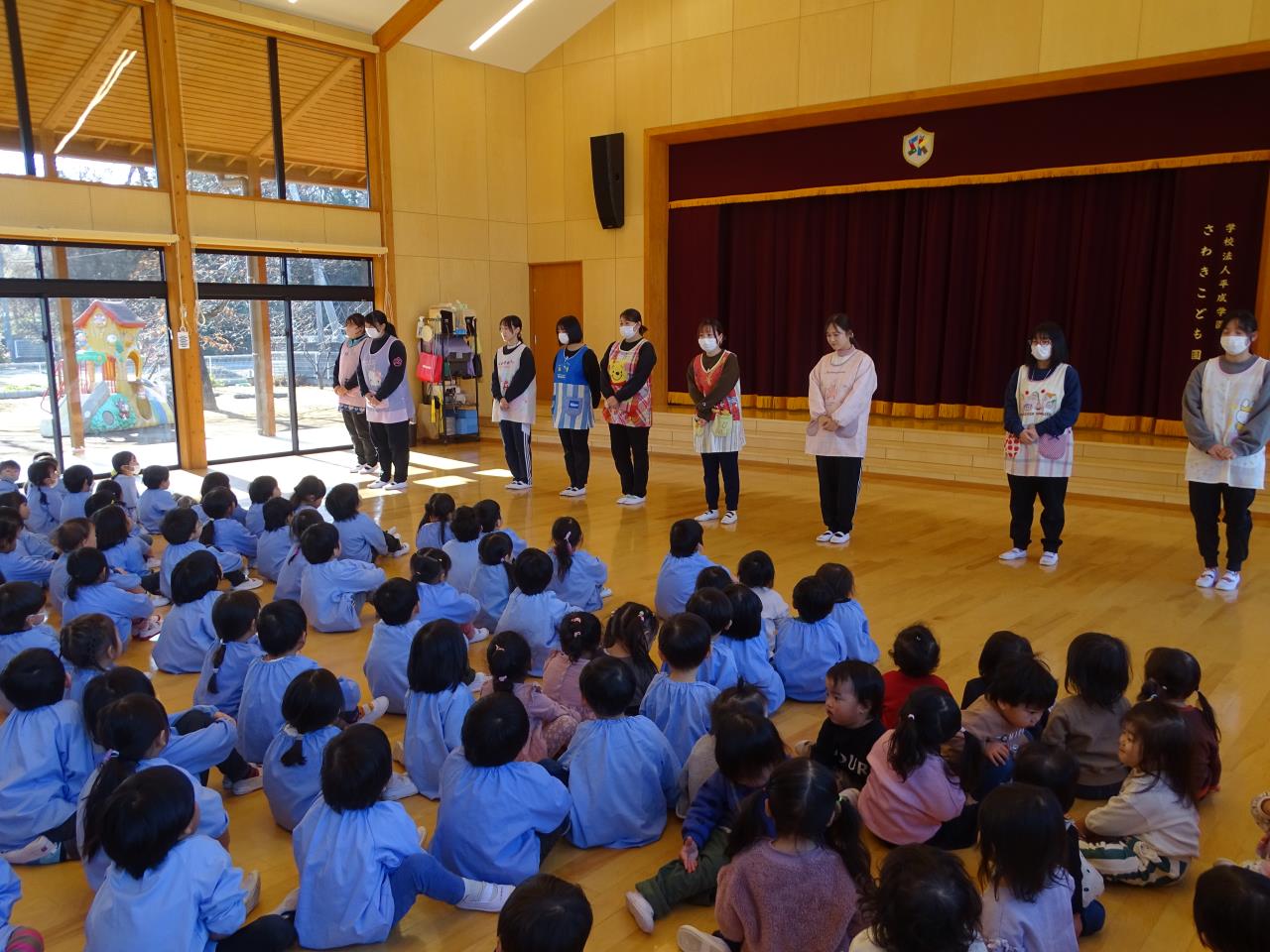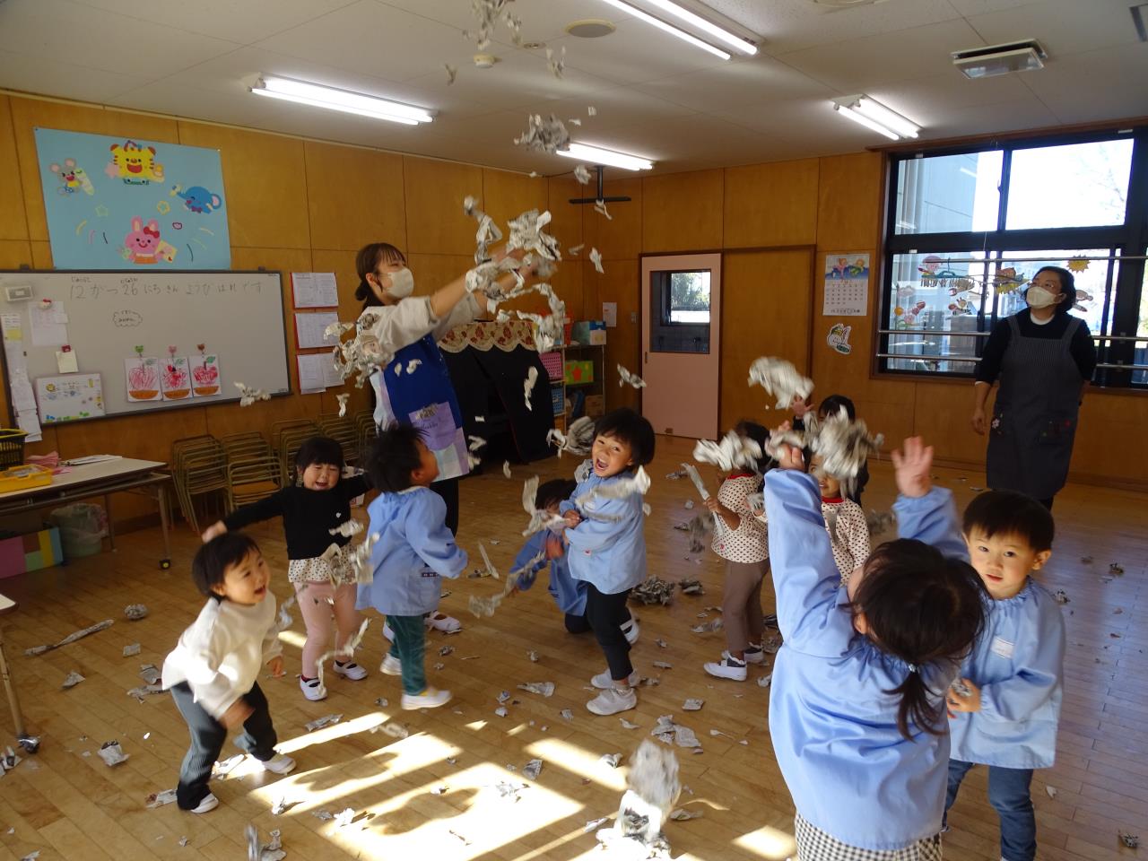 | あっという間に月日が過ぎ 今年も残りわずかとなりました。 この1年、 たくさん遊び 様々な活動や行事を経験して すてきな思い出がいっぱい できましたね♪ お休み中も はやね はやおきを心がけて 寒さに負けず元気に 過ごしてください! こども園にきたら また、おもいっきり 遊びましょうね♡ 保護者のみなさまには たくさんのご理解と ご協力をいただき ありがとうございました! それでは、 良いお年をお迎えください♡ |