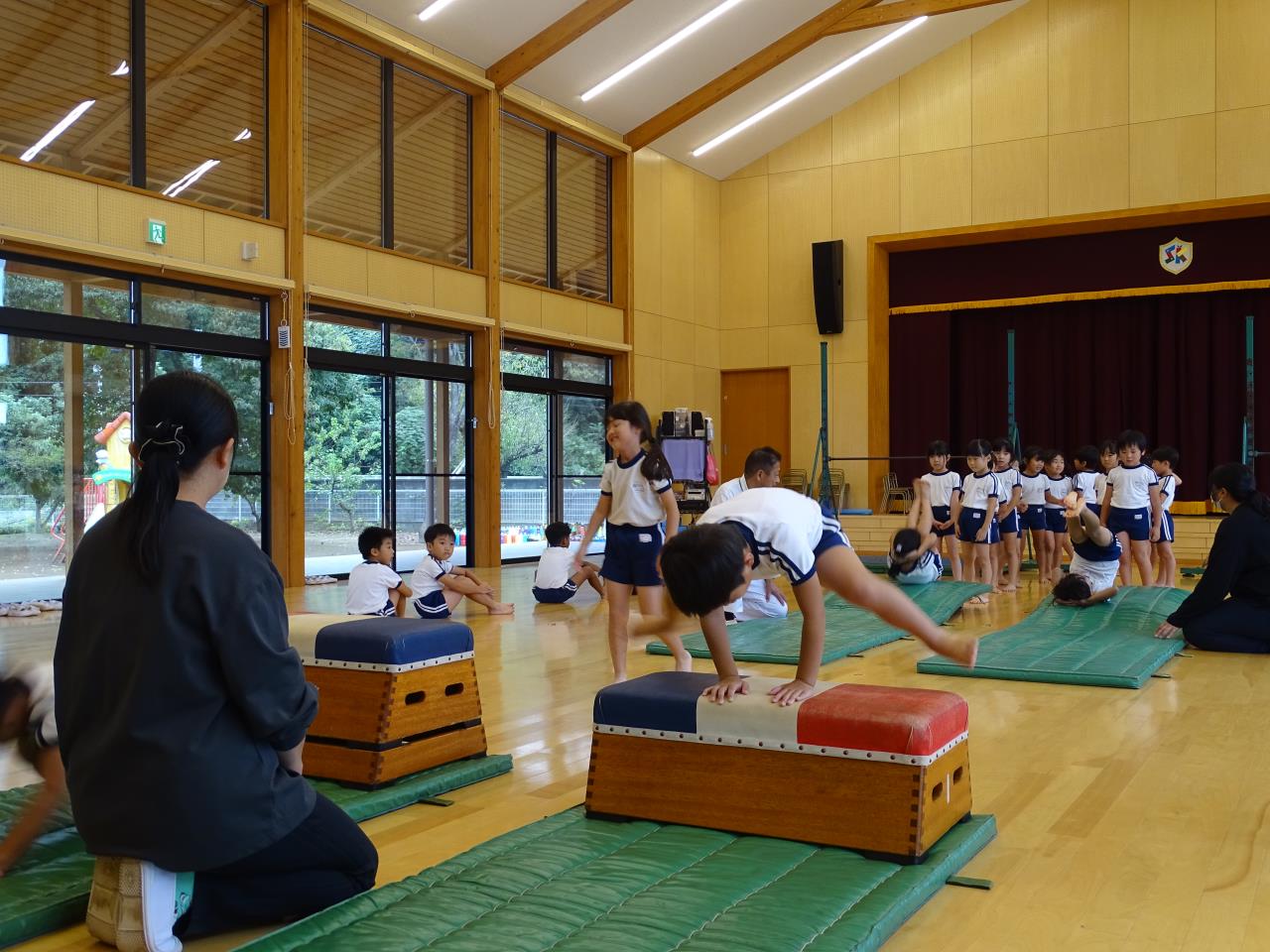 専門の講師による体育教室を 行っています! 鉄棒やマット、跳び箱などを使って 体を動かす楽しさを味わっています☆ 10月から年少さんもスタートしました☆ 初めての活動に目をキラキラ輝かせながら 元気いっぱいに取り組んでいます♫ 体育教室を通じて丈夫な体を作り 様々な事にどんどん 挑戦していきましょう!!  |