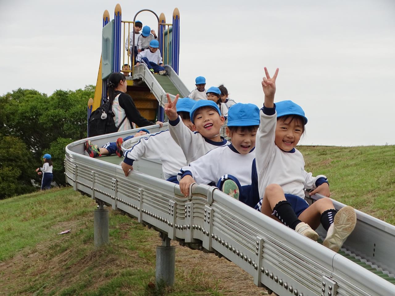 ♫えんそくだ~ うれしいなぁ~ バスに乗って 元気に歌をうたいながら 向かった先は 「小貝川ふれあい公園」です! 公園では みんなでお散歩をしたり 遊具で仲良くあそびました♪ 芝生のおやまの上にあった ローラーすべりだいは 長くてスピードがでるので とてもおもしろくて 何度も繰り返しすべって あそびました(*^-^*) ちょうちょうの形をした 建物の中には 色々な種類の 虫やお魚がたくさんいたので ビックリしました!!!!! 秋を感じながら 楽しい時間を過ごし と~っても素敵な思い出が またひとつ増えました(*^^*)♡  |